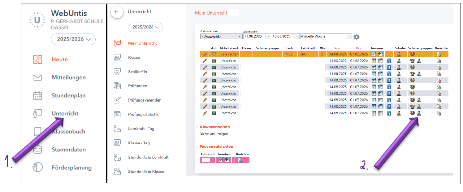 In der linken Spalte auf Unterricht klicken (1). Anschließend auf das rechte Symbol bei Schülergruppen klicken (2) und dann die entsprechenden Schüler*innen auswählen. Ich empfehle bei kleineren Gruppenanteilen erst einmal alle Haken herauszunehmen (Auswahl) und dann die einzelnen Schüler*innen anzuwählen. Wenn Schüler*innen im Laufe des Schuljahres dazu kommen, kann man bei „von“ ein Datum einsetzen (analog gilt das für das Verlassen eines Schülers oder einer Schülerin der Lerngruppe)